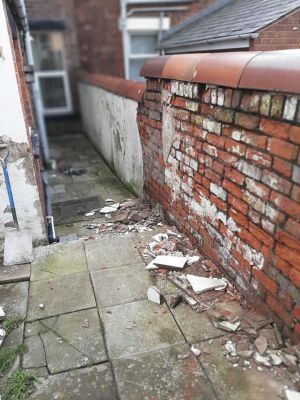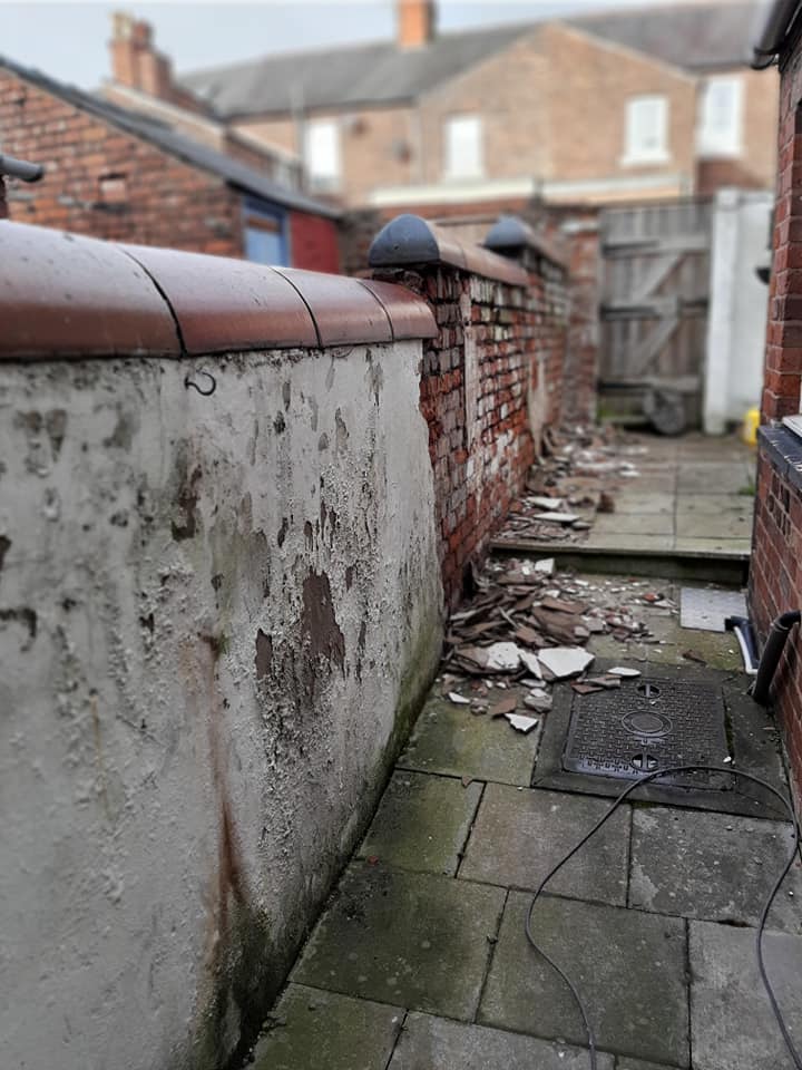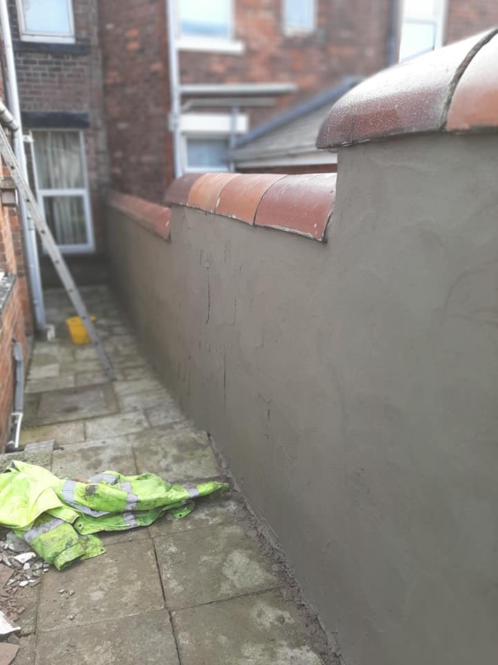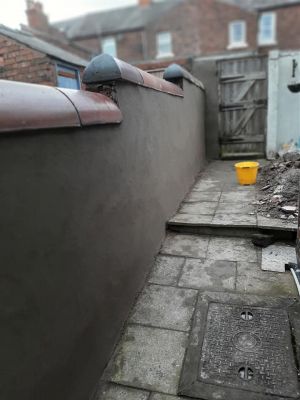 Stripping render of an old wall in back garden and renewing ready for painting.